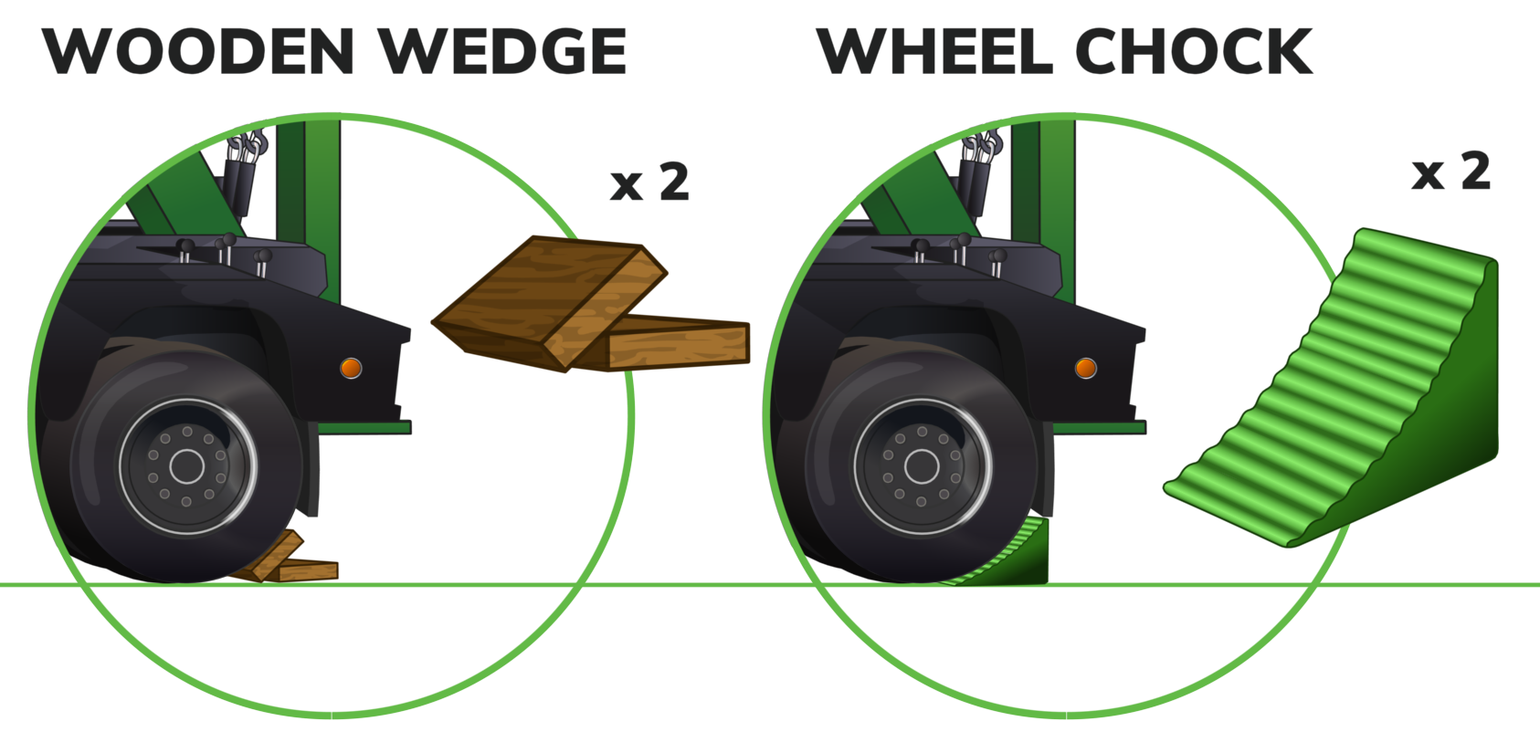 Two pieces of hardwood can be used to create a wedge can increase the anchor ability of a wrecker. You will likely need to prepare for this by cutting the hardwood to size. If you are only using one, install it on the inner of the dual wheels in case a second needs to be installed. The same result can be achieved by using a manufactured tire chock. Be sure to place the hardwood wedge or tire chock on both rear tires.