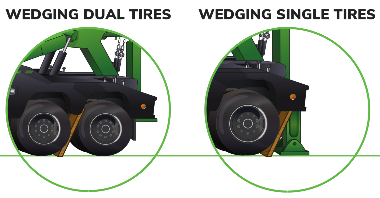If the wrecker does not have dual tires, the same affect can be achieved by placing the piece of hardwood between the rear tire and the spade or outrigger, as demonstrated in the image above.