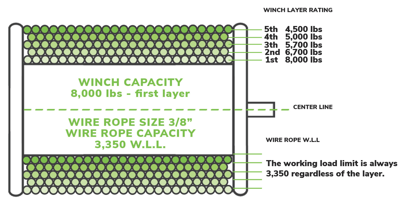 As shown below, at no time will any one single line or any single leg of a multi-line layup have a WLL equal to or greater than the winch’s posted layer ratings and line pull. This applies to horizontal winching or vertical lifting; while using the manufacturer’s recommended size, grade and type of rope for the winch.