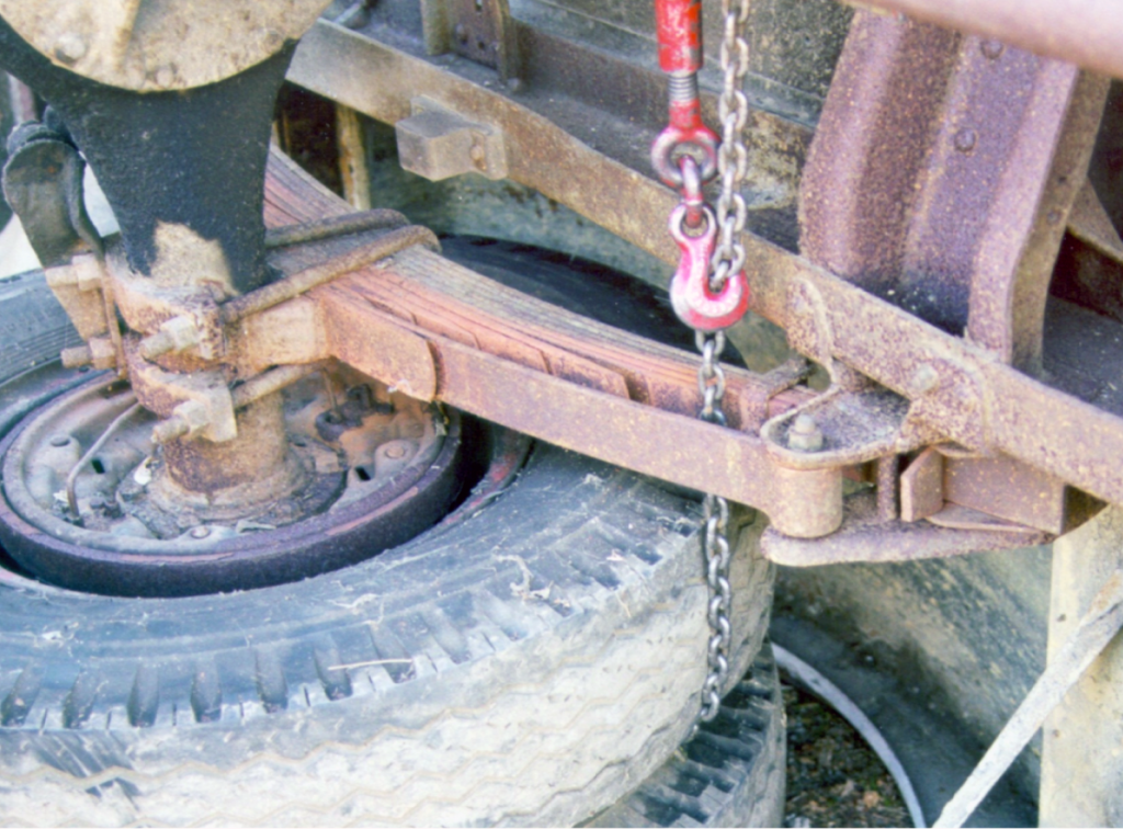 Wrap a chain around the dual wheels (hooked to it self). The chain comes up across the rubber tread of the tire and in between the spring. This will then go to the frame rail, looped back down and attach to a binder.
