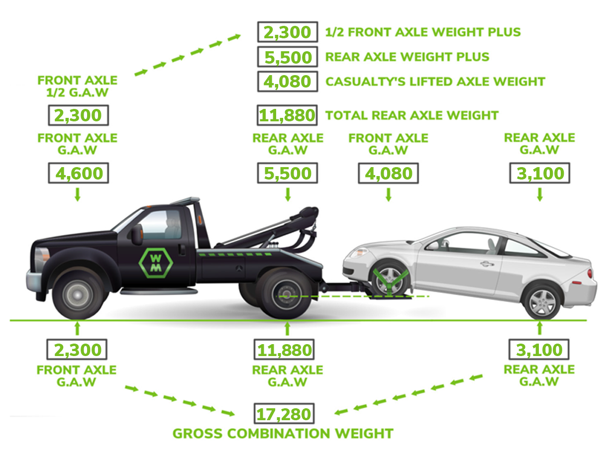 The other half of the front axle weight of the power unit is calculated into the rear axle weight of the power unit and the casualty’s lifted axle weight.